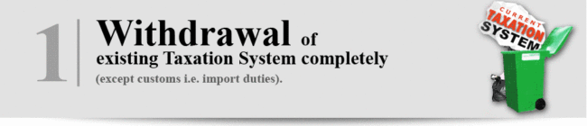 - केंद्र या राज्य सरकारों के साथ-साथ स्थानीय निकायों द्वारा वसूले जाने वाले प्रत्यक्ष और अप्रत्यक्ष, सभी करों का पूर्ण खात्मा।