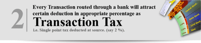 - ये टैक्सेज बैंक ट्रांजैक्शन टैक्स (बीटीटी) में तब्दील किए जाने थे जिसके अंतर्गत बैंक के अंदर सभी प्रकार के लेनदेन पर लेवी (2 प्रतिशत के करीब) लागू होती. यह प्रक्रिया सोर्स पर सिंगल पॉइंट टैक्स लगाने की होती. इससे जो पैसे मिलते उसे सरकार के खाते में विभिन्न स्तर (केंद्र, राज्य, स्थानीय निकाय आदि के लिए क्रमशः 0.7%, 0.6%, 0.35% के हिसाब से) पर बांट दिया जाता. इसमें संबंधित बैंक को भी 0.35% हिस्सा मिलता. हालांकि, बीटीटी रेट तय करने का हक वित्त मंत्रालय और रिजर्व बैंक ऑफ इंडिया के पास होता.