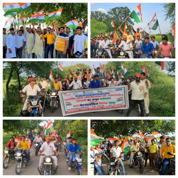 आरा. नमामि गंगे परियोजना नेहरू युवा केंद्र भोजपुर,युवा कार्यक्रम खेल मंत्रालय भारत सरकार के तत्वधान में आजादी के अमृत महोत्सव के पूर्ण होने पर हर घर तिरंगा कार्यक्रम को भव्यता देने के उद्देश्य से मोटरसाइकिल तिरंगा यात्रा का आयोजन किया गया. इस कार्यक्रम में लगभग 150 से अधिक संख्या में मोटरसाइकिल द्वारा युवकों ने 50 किलोमीटर की दूरी तय करके कार्यक्रम की भव्य रूप प्रदान किया. इस कार्यक्रम में अतिथि के रूप में बड़हरा के समाजसेवी और हर घर तिरंगा के भोजपुर जिला के जिला संयोजक सूर्यभान सिंह, समाजसेवी और बड़हरा प्रखंड के अध्यक्ष रामवतार सिंह , वरुण कुमार सिंह , जिला परियोजना अधिकारी अमित कुमार सिंह ने रैली का शुभारंभ किया.