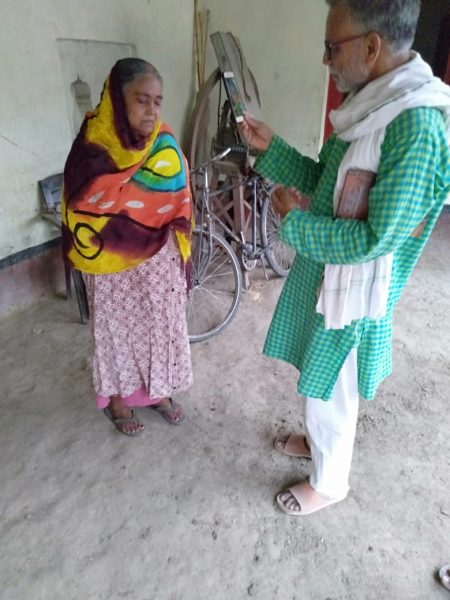 एक बूढा जिसकी नजर कमजोर हो चुकी थी, चापाकल पर अपने नातियों को नहला रहा था। एक बच्चे के सिर में साबुन लगा रगड रहा था। उसे जब हमारे बारे में पता चला तो नाती को नहाने के लिए कह कर बह सामने खाट पर बैठ गया और हाथ जोड कहा।