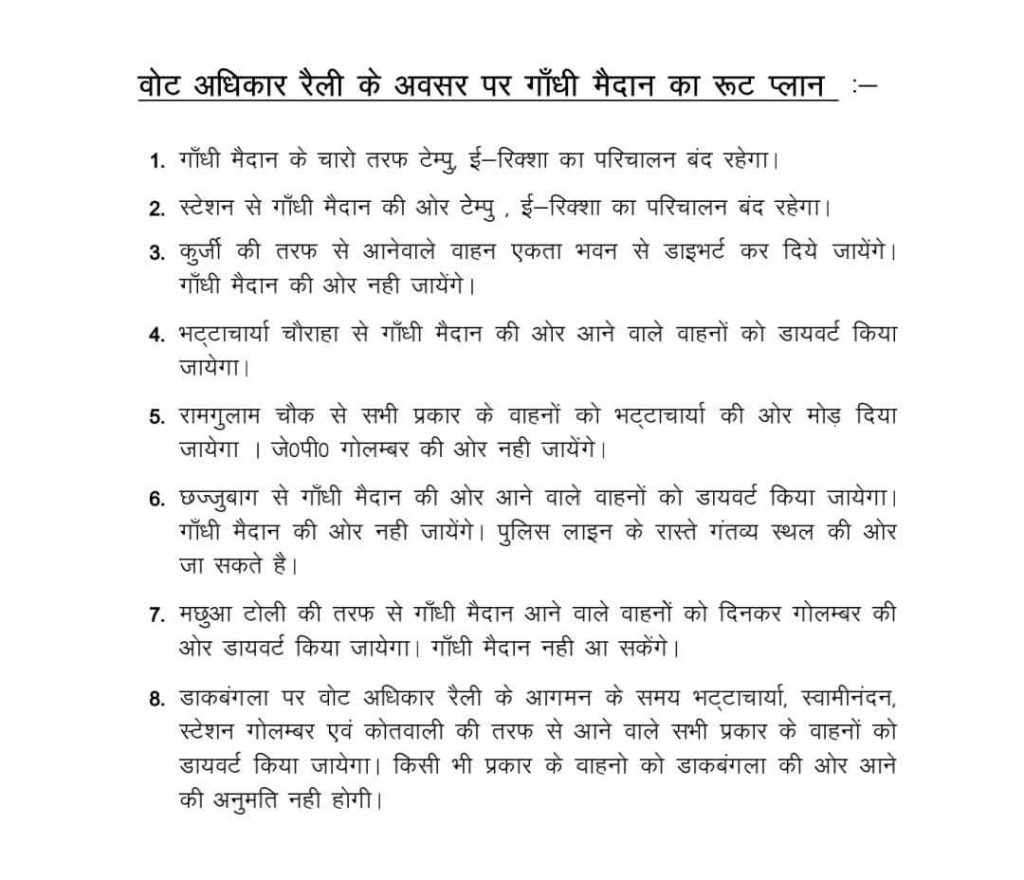 इन सबके बीच पटना जिला प्रशासन ने कहा है कि कांग्रेस सहित किसी भी व्यक्ति या दल की ओर से गांधी मैदान में रात्रि में रुकने या किसी अन्य कार्य के लिए अनुमति नहीं मांगी गई है. जिला प्रशासन पटना से दो अनुमति मांगी गई थी जो सभा एवं रैली के लिए थी. सभा के लिए अनुमति दे दी गई थी. रैली के लिए अनुमति माननीय उच्च न्यायालय द्वारा पारित आदेश के अनुरूप कुछ प्रतिबंधों के साथ दी गई है.