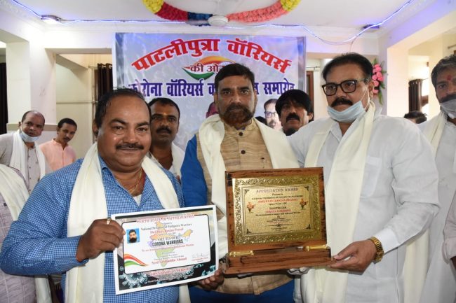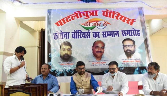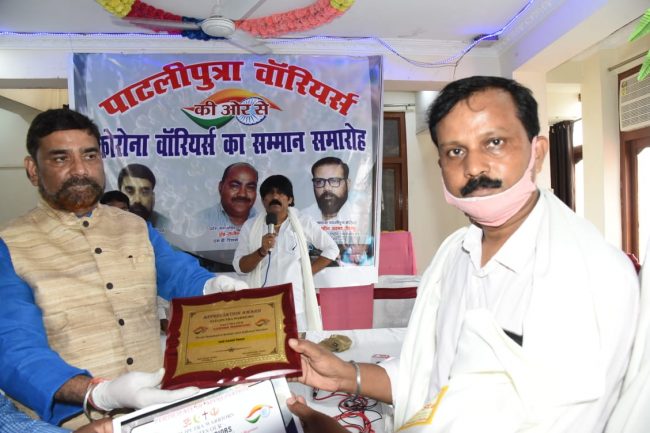 जदयू प्रवक्ता राजीव रंजन प्रसाद ने पाटलिपुत्र वारियर्स द्वारा कोरोना योद्धाओं के सम्मान में आयोजित समारोह में इस वैश्विक आपदा के मुश्किल समय में अपनी जान पर खेलकर मानवता की सेवा करने वाले शूरवीरों को सलाम करते हुए कहा कि पूरी दुनिया को तबाही के कगार पर पहुंचाने वाली इस विभीषिका से निबटने में मुख्यमंत्री नीतीश कुमार के नेतृत्व में राज्य सरकार के प्रबंधन की सर्वत्र सराहना हो रही है. वहीं अनेक सामाजिक संगठनों ने पाटलिपुत्र वारियर्स के साथ जुड़ कर लोगों को राशन ,पका भोजन, मास्क, सैनिटाइजर ,साबुन के साथ दूध फल एवं सब्जी तक पहुचाने का कार्य किया.