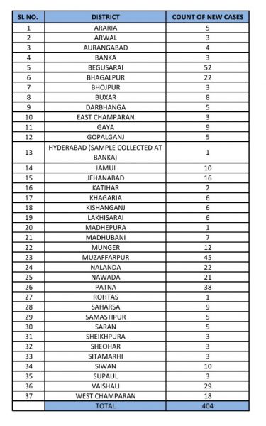 रविवार को सबसे ज्यादा 52 नए मरीज बेगूसराय में मिले हैं जबकि मुजफ्फरपुर में 45 और पटना में 38 नए मरीज मिले हैं. रविवार को किस जिले में कितने मरीज मिले हैं कि पूरी रिपोर्ट नीचे दी गई है.