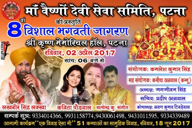 29 अप्रैल से चैत्र मास का नवरात्र शुरू हो रहा है. इस मौके पर नवरात्र के 6ठे दिन पटना के श्रीकृष्ण मेमोरियल हॉल में भगवती जागरण का आयोजन हो रहा है. ये आयोजन मां वैष्णो देवी सेवा समिति के द्वारा हो रहा है.