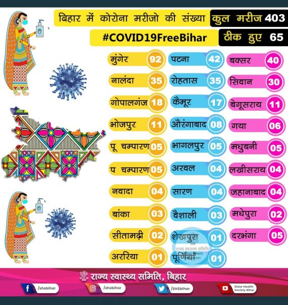 बिहार में कोरोना मरीजों का कुल आंकड़ा 400 के पार कर गया है. ताजा अपडेट के मुताबिक बिहार में अब 403 कोरोना पॉजिटिव केस हैं. इस बार पटना में 2 और मरीजों का पता चला है. इनमें से एक राजधानी के राजा बाजार इलाके से है जबकि दूसरा पालीगंज से. इससे पहले आज एक और मामला नौबतपुर में सामने आया था जहां एक 24 साल की युवती कोरोना संक्रमित पाई गई. पटना में अब 42 मरीज हो गए हैं. इनके अलावा भोजपुर के भलुहीपुर से 2, बक्सर के डुमरांव से 2 और रोहतास, मधेपुरा, औरंगाबाद, सीतामढ़ी, वैशाली और रोहतास के एक-एक मरीज मिले हैं.