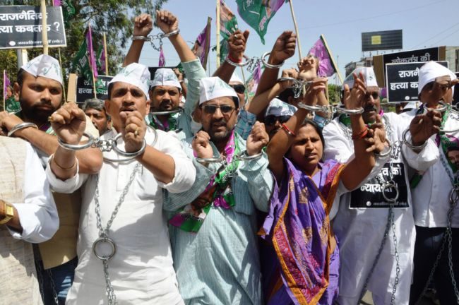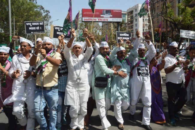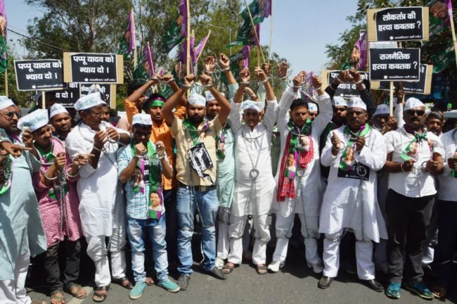 हथकड़ी-बेड़ी पहन कर जन अधिकार पार्टी(लो) कार्यकर्ताओं ने किया प्रदर्शन