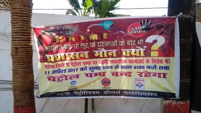 बता दें कि पटना पेट्रोलियम डीलर्स एसोसिएशन ने पहले ही घोषणा की थी कि 11 अप्रैल को सुबह 6 बजे से शाम 6 बजे तक जिले के सभी पेट्रोल पंप बंद रहेंगे. पंपों पर बढ़ती आपराधिक घटनाओं के विरोध में ये बंद रखा गया था. इसके साथ ही पेट्रोलियम डीलर्स एसोसिएशन ने चेतावनी दी है कि अगर सरकार सभी पेट्रोल पंपों की सुरक्षा की व्यवस्था नहीं करेगी तो वे अनिश्चितकालीन हड़ताल करेंगे.