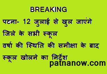 कल यानि बुधवार 12 जुलाई से पटना जिले के सभी स्कूल पहले की तरह खुले रहेंगे. पटना डीएम संजय कुमार अग्रवाल ने वर्षा की स्थिति की समीक्षा के बाद आज ये आदेश जारी किया है. बता दें कि भारी बारिश, जलजमाव और आपदा विभाग की चेतावनी के मद्देनजर मंगलवार को क्लास 8 तक के सभी स्कूलों को बंद करने का निर्देश डीएम ने जारी किया था.
