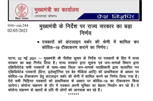 पटना, 2 मई ।। बिहार सरकार ने बिहार के पत्रकारों को फ्रंटलाइन वर्कर की श्रेणी में शामिल करने का निर्णय लिया है. घोषणा के अनुसार मुख्यमंत्री नीतीश कुमार के निर्देश पर पत्रकारों के हित में राज्य सरकार ने बिहार सरकार के सूचना एवं जन-संपर्क विभाग द्वारा निर्गत प्रेस प्रमाण पत्र धारक (एक्रिडियेटेड पत्रकार) सभी पत्रकारों के साथ-साथ जिला जन-सम्पर्क पदाधिकारी द्वारा सत्यापित नन एक्रिडियेटेड पत्रकारों (प्रिन्ट, इलेक्ट्रॉनिक एवं बेव मीडिया आदि) को भी प्राथमिकता के आधार पर कोविड-19 टीकाकरण हेतु फ्रंटलाइन वर्कर की श्रेणी में शामिल करने का निर्णय लिया गया है.