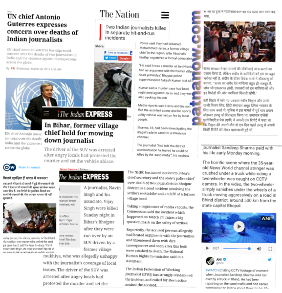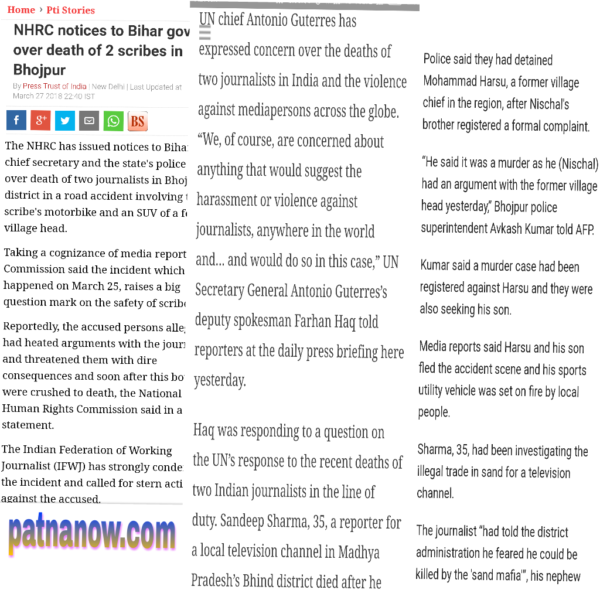 आरा, 31 मार्च. भोजपुर में घटित दोहरे पत्रकार हत्याकांड सहित मध्यप्रदेश में भी पत्रकार की हत्या की गूंज यूएन तक पहुंच गई है. इस घटना को न सिर्फ विभिन्न अंतर्राष्ट्रीय अखबारों ने प्रमुखता दी है बल्कि यूएन में पत्रकारों की ऐसी हत्याओं पर गहरी चिंता ब्यक्त की है.