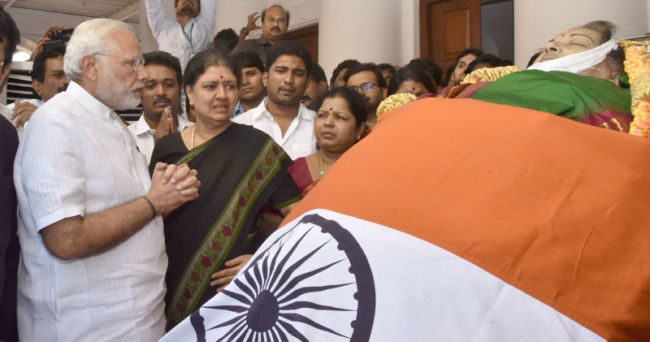 प्रधानमंत्री नरेन्द्र मोदी ने जे. जयललिता के निधन पर शोक व्यक्त करते हुए कहा कि जयललिता के निधन से काफी दुखी हूं. उनके निधन से भारतीय राजनीति में एक बड़ा खालीपन आ गया है.जयललिता जी का लोगों से लगाव, गरीबों, महिलाओं और हाशिए के लोगों के कल्याण के लिए उनकी चिंता हमेशा एक प्रेरणास्रोत बना रहेगा.दु:ख की इस घड़ी में मेरी संवेदनाएं और प्रार्थनाएं तमिलनाडु की जनता के साथ है.ईश्वर उन्हें इस अपूरणीय क्षति को सहन करने की हिम्मत और शक्ति दे.मैं उन असंख्य अवसरों को अपने मन में हमेशा संजोकर रखूंगा, जब मुझे जयललिता जी से बातचीत करने का अवसर मिला था. उनकी आत्मा को शांति मिले.