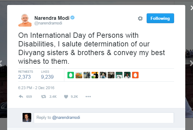 प्रधानमंत्री नरेन्द्र मोदी ने शनिवार को विकलांग व्यक्तियों के लिए अंतर्राष्ट्रीय दिवस के मौके पर दिव्यांगों के दृढ़ संकल्प को सलाम किया. मोदी ने ट्वीट कर कहा, मैं हमारे दिव्यांग भाइयों और बहनों के दृढ़ संकल्प को सलाम करता हूं. प्रधानमंत्री नरेन्द्र मोदी ने कहा, “आईए हम अपने वर्तमान प्रयासों को नए उत्साह से जारी रखें और एक ऐसे राष्ट्र का निर्माण करें, जहां सभी के लिए समानता हो.वर्ष 1992 से हर वर्ष तीन दिसंबर को दुनियाभर में विकलांग व्यक्तियों के लिए संयुक्त राष्ट्र अंतर्राष्ट्रीय दिवस मनाया जाता है.