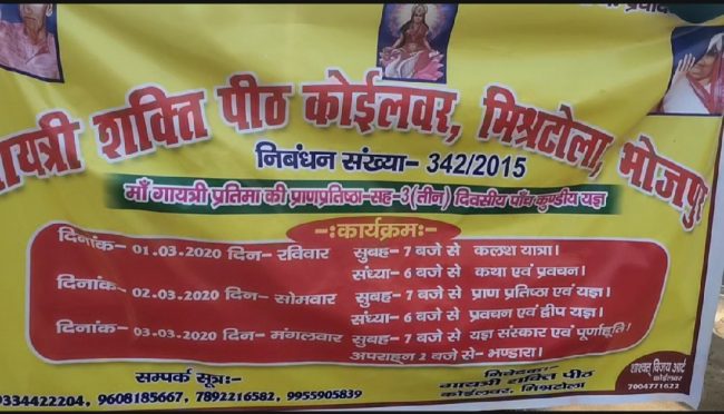 यह कलश यात्रा नगर के वार्ड 3 स्थित नवनिर्मित गायत्री मन्दिर से शुरू होकर कोइलवर के पुल स्थित बाबा दिनेश्वर नाथ धाम के पास सोन नदी के गौरैया घाट पहुंची. जहां कलश में पवित्र जल भरने के बाद सभी लोग वापस मंदिर स्थल पहुंचे जहा निर्धारित स्थानों पर कलश स्थापित किये जाने के बाद यह यात्रा संम्पन्न हुई.