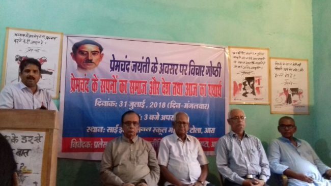 आज प्रलेस, जलेस, जसम, युवानीति, कला कम्यून और इप्टा की ओर से प्रेमचंद जयंती के अवसर पर आरा के महावीर टोला स्थित साईं इंटरनेशनल स्कूल में “प्रेमचंद के सपनों का समाज और देश तथा आज का यथार्थ” विषय पर बहस आयोजित की गयी। कार्यक्रम में बहस के विषय को खोलते हुए प्रो. रवींद्रनाथ राय ने प्रेमचंद के कहानियों, उपन्यासोंऔर उनके वैचारिक लेखों का हवाला देकर आज के सामाजिक और आर्थिक सवालों को श्रोताओं के सामने रखा। उन्होंने देश में धार्मिक मान्यताओं को आडंबर में तब्दील करके देश की स्थिति को विकराल बनाने वालों को निशाने पर लिया। इसके बाद रामनाथ ठाकुर ने समाज के बिगड़ते हुए हालत के लिए शिक्षकों को जिम्मेदार बताया। शिक्षक और कला कम्यून के प्रसिद्ध चित्रकार राकेश दिवाकर ने कहा कि शिक्षकों को शिक्षा से इतर कई कार्यों में लगा दिया जाता है, जिससे उनके मुख्य कार्य बाधित हो जाते हैंl नेता अजित कुशवाहा ने प्रेमचंद की रचनाओं में मौजूद सामाजिक, सांस्कृतिक, आर्थिक और वैचारिक सवालों को आज के समय में अर्थपूर्ण विश्लेषण करने की बात कही। कवि सुमन कुमार सिंह ने आज की समसामयिक चुनौतियों के संदर्भ में कहा कि ये लंबे समय से पैर फैलाते हुए सामने आयी हैं। कुछ व्यक्ति धर्म के ठेकेदार हो जा रहे हैं। कोई निजी स्कूल शिक्षा का मानक तय करने लगती है। और इन पर बोलना और कुछ कहना खतरे से खाली नहीं है। कवि ओमप्रकाश मिश्र ने प्रेमचंद के साहित्य को साहित्यकारों और समाज के लिए प्रकाश स्तंभ बताया। उन्होंने कहा कि प्रेमचंद एक ऐसे लेखक हैं जिनके लेखन में देश और उसके सामाजिक, आर्थिक, परिवारिक संघर्ष को हम देखते-समझते हैं। प्रो. किरण कुमारी ने अपने वक्तव्य में कहा कि देश के लोगों की नैतिकता में ह्रास आया है। समाज यौन पिपासु बनता जा रहा है।