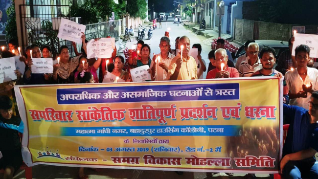 पटना (ब्यूरो रिपोर्ट) | आपराधिक घटनाएँ जैसे चोरी, छिनतई इत्यादि से परेशान होकर बिहार के डीजीपी एवं पुलिस प्रशासन का ध्यान आकर्षित कराने के उद्देश्य से शनिवार 3 अगस्त 2019 को संध्या समय महात्मा गाँधी नगर, बहादुरपुर हाऊसिंग कॉलोनी, पटना क्षेत्र में स्थानीय निवासियों द्वारा वार्ड पार्षद पूनम शर्मा के नेतृत्व में सपरिवार एक सांकेतिक शांतिपूर्ण प्रदर्शन एवं धरना का आयोजन किया गया. इससे पहले महात्मा गाँधी नगर, बहादुरपुर हाऊसिंग कॉलोनी, पटना के स्थानीय वाशिंदों द्वारा रोड संख्या 1, 2, और 3 में शांति मार्च करते हुए रोड संख्या 2 के अंजली गैस ऑफिस के समीप एकत्रित हुए.