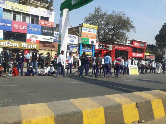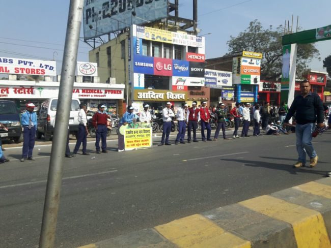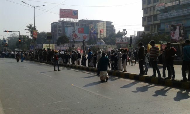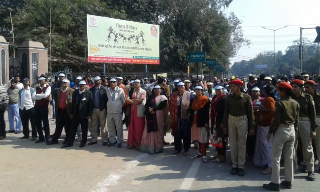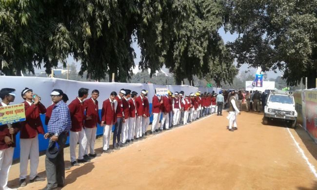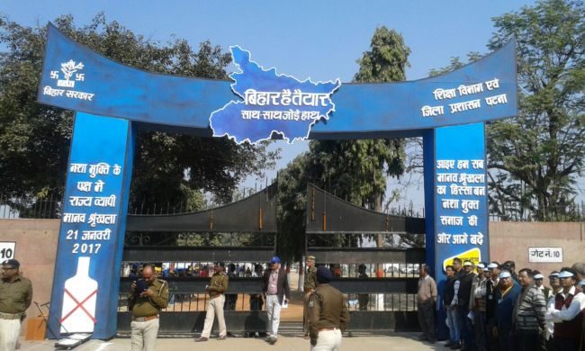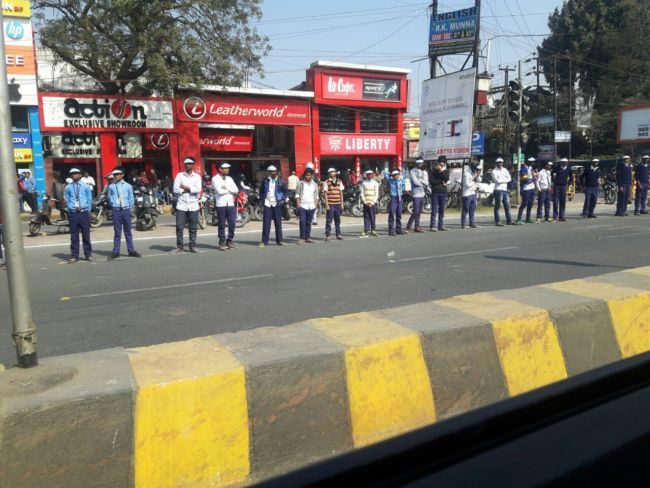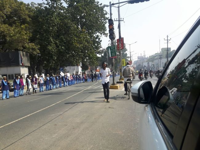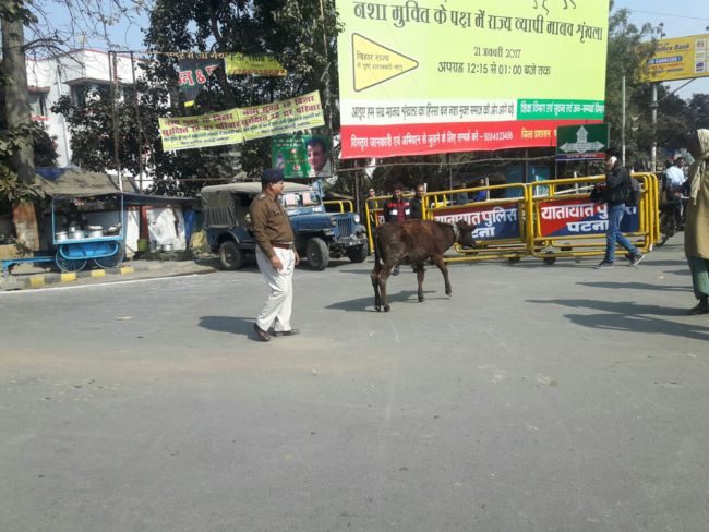 राजधानी पटना की सड़कों पर शराबबंदी नशा मुक्त बिहार के नारे के साथ विभिन्न स्कूलों के छात्र-छात्राएं मानव श्रृंखला में शामिल हो रहे है ,उन्हें देखने वालों की भीड़ भी जुट रही है .एक लेन की सड़क खाली है जबकि दूसरे लेन से यातायात का परिचालन हो रहा है .तस्वीरों में देखिये पटना में बने मानव श्रृंखला .