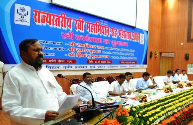 पटना के फुलवारीशरीफ स्थित बामेती परिसर में गुरुवार को 2 दिवसीय रबी महोत्सव की शुरुआत हुई. महोत्सव का उद्घाटन करते हुए कृषि मंत्री राम विचार राय ने कहा की मुख्यमंत्री नीतीश कुमार का कृषि के विकास पर विशेष जोर है . राज्य सरकार इस दो दिवसीय कार्यशाला के जरिये कृषि के उत्पादन बढ़ाने के लिए रूप रेखा तैयार की जायेगी . उन्होने कार्यशाला में आये कृषि वैज्ञानिकों से कहा की विभिन्न जिलों से आये कृषि पदाधिकारियों से अपने सुझाव देने की बात कही . मंत्री ने कहा की फसलों के उत्पादन एवं उत्पादकता बढाने तथा सरकार की महत्वाकाक्षी योजनाओं का लाभ किसानो तक पहुंचाने के लिए सरकार पूरी तरह गंभीर है . उन्होंने कहा की राज्य में डीबीटी का कार्यान्वयन अनुदानित दर पर बिज वितरण , जैविक खेती को बढ़ावा देना , गेंहू की खेती , आवश्कता के अनुसार दलहन उत्पादन पर जोर दिया . उन्होंने कहा की रबी अच्छादन वर्ष 2016 – 17 में 23 . 25 लाख हेक्टेयर एवं उत्पादन 7 . 05 लाख मीट्रिक टन रखा गया है . साथ ही गेंहू की उत्पादकता को बढाकर 3400 किलोग्राम प्रति हेक्टेयर करने का लक्ष्य है . उन्होंने किसानो से प्रमाणित बीजो का उपयोग करने का आह्वान किया .