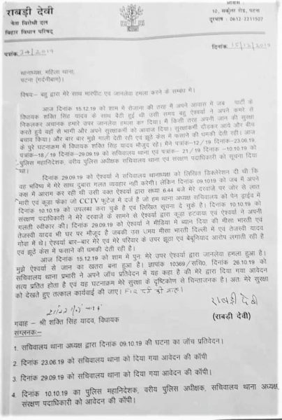 “आज दिनांक 15 दिसंबर को शाम में रोजाना की तरह मैं अपने आवास में जब पार्टी के विधायक शक्ति सिंह यादव के साथ बैठी हुई थी उसी समय बहू ऐश्वर्या ने अपने कमरे से निकलकर अचानक हमारे ऊपर जानलेवा हमला कर दिया। मैं किसी तरह अपनी जान की सुरक्षा करते हुए वहां से भागी और अपने सुरक्षाकर्मी को आवाज दिया। सुरक्षाकर्मी दौड़कर आए और बीच-बचाव किया। और बार-बार मुझे गाली देती रही एवं झूठे केस में फंसाने की धमकी देती रही। आज के पूरे घटनाक्रम में विधायक शक्ति सिंह यादव मौजूद रहे। मैंने पत्रांक 12/19 दिनांक 23.06.19, पत्रांक 18/19 दिनांक 20.09.19 को सचिवालय थाना एवं पत्रांक 21/19 दिनांक 10.10.19 को पुलिस महानिदेशक, वरीय पुलिस अधीक्षक, सचिवालय थाना एवं संरक्षण पदाधिकारी को सूचना दिया था।