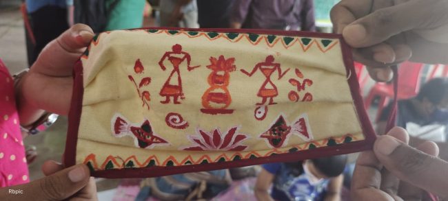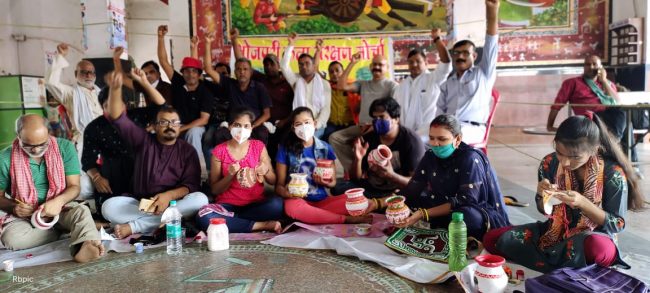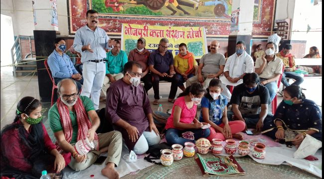 भोजपुरी कला संरक्षण मोर्चा द्वारा भोजपुरी चित्रकला को सम्मानपूर्ण स्थान दिलाने के लिए विगत 17 दिनों से चल रहे शांतिपूर्ण आंदोलन के दौरान आज मास्क पेंटिंग और कलश पेंटिंग के माध्यम से लोक संवाद स्थापित किया गया. मास्क और कलश पेंटिंग करनेवालों में वरिष्ठ चित्रकार सुरेश पांडेय,कोषाध्यक्ष कमलेश कुंदन,रौशन राय,कौशलेश कुमार,रूपा कुमारी, निक्की कुमारी,शालिनी कुमारी,रुख्सार परवीन,गुड़िया कुमारी,अमन राज आदि प्रमुख थे.