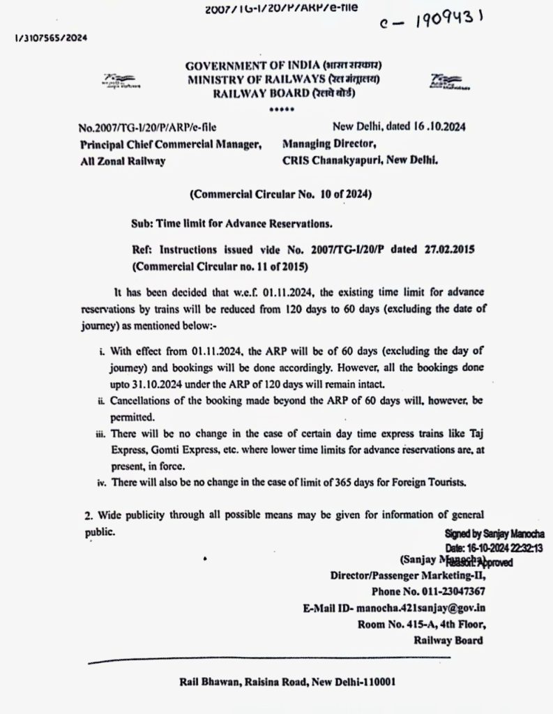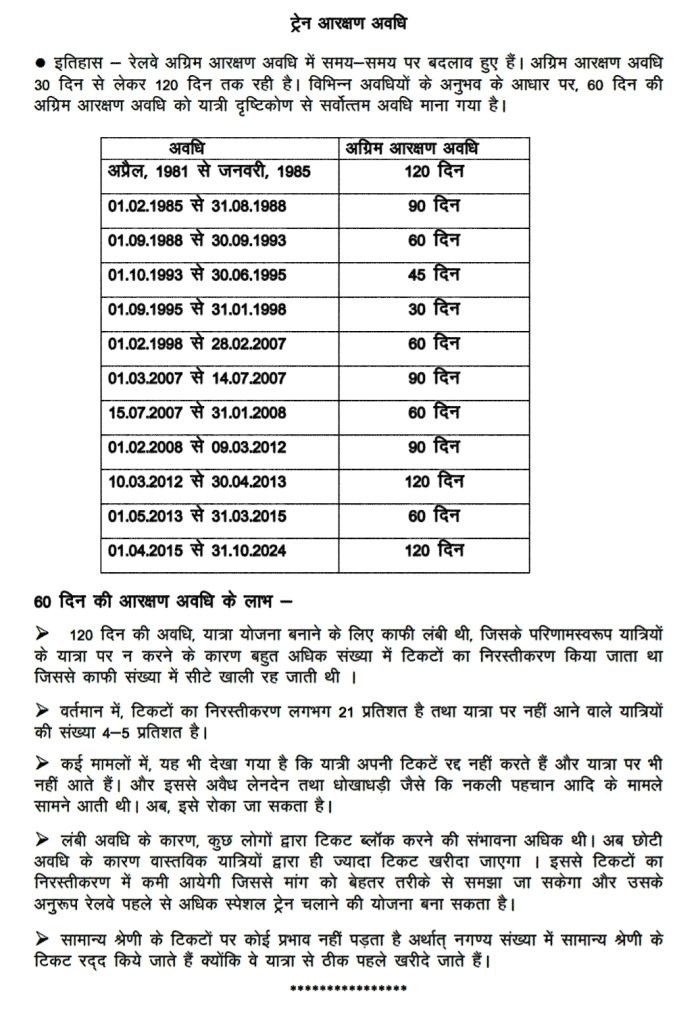 31 अक्टूबर 2024 तक बुक किए गए रेलवे टिकटों पर यह नियम प्रभावी नहीं होगा. यानी रेलवे यात्री 31 अक्टूबर तक अगले 120 दिन का टिकट बुक करा सकेंगे. वहीं विदेशी पर्यटकों के लिए 365 दिन के एडवांस टिकट बुकिंग में कोई फेरबदल नहीं किया गया है.