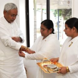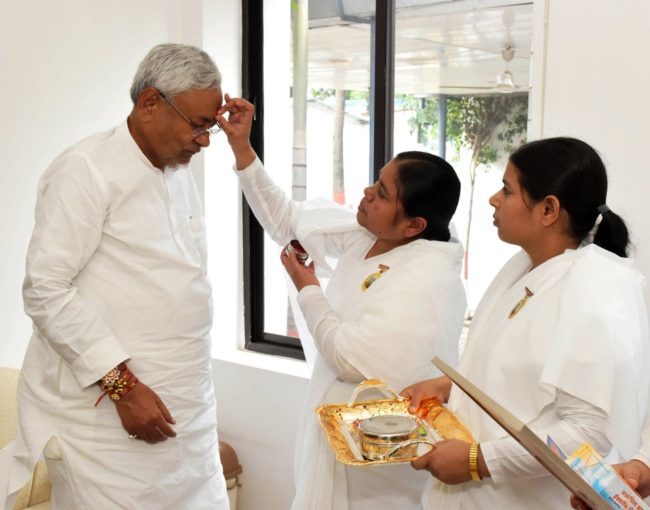 पटना (ब्यूरो रिपोर्ट) | रक्षा बंधन के शुभ अवसर पर मुख्यमंत्री नीतीश कुमार से आज 7, सर्कुलर रोड में प्रजापिता ब्रह्मकुमारी ईश्वरीय विश्वविद्यालय के एक शिष्टमंडल ने मुलाकात की। विश्वविद्यालय की बहनों ने मुख्यमंत्री की कलाई पर राखी बांधी, तिलक लगाया एवं मिठाई खिलाकर मुख्यमंत्री नीतीश कुमार के