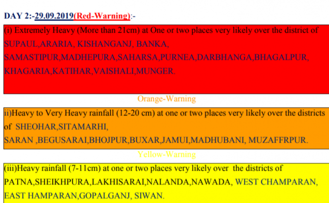 28 सितंबर को पटना समेत कई जिलों में भारी बारिश ने जनजीवन अस्त व्यस्त कर दिया. पटना में तो इस बार बारिश ने कई सालों का रिकॉर्ड तोड़ दिया है. हर तरफ पानी ही पानी दिख रहा है और समाचार लिखे जाने तक भारी बारिश जारी है. मौसम विभाग के पूर्वानुमान के मुताबिक फिलहाल भारी बारिश से पटना समेत पूरे बिहार को राहत मिलने के कोई आसार नहीं हैं. 29 सितंबर को सुपौल, अररिया, किशनगंज, बांका, समस्तीपुर, मधेपुरा, सहरसा, दरभंगा, भागलपुर, खगड़िया, वैशाली और मुंगेर जिले में मौसम विभाग ने भारी बारिश (21 सेमी से ज्यादा) का रेड अलर्ट जारी किया है.
