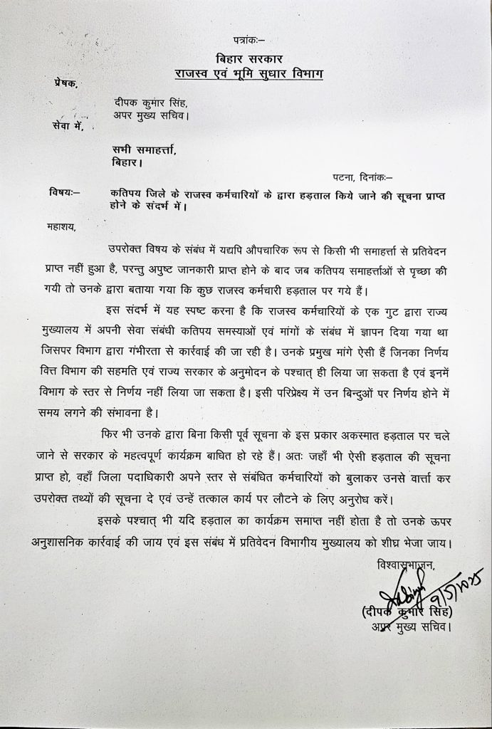 पटना।। राजस्व एवं भूमि सुधार विभाग ने राजस्व कर्मचारियों की हड़ताल को लेकर चेतावनी जारी कर दी है. विभाग के अपर मुख्य सचिव दीपक कुमार सिंह ने सभी डीएम को संबोधित करते हुये कहा है कि