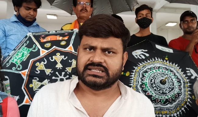 आरा,12 जून(ओ पी पांडेय). जून का दूसरा सप्ताह खत्म होने वाला है और बिहार ने मानसून की दस्तक भी दे दी है. पहले दिन की ही फुहार से मौसम सुकून भरा हो गया है. इस बीच पिछले 12 दिनों से आंदोलनरत भोजपुर के चित्रकारों ने छाते को भोजपुरी पेंटिंग से सजाना शुरू कर दिया है. शुक्रवार से ही छातों के ऊपर विंभिन्न कलाकृतियों को कलाकारों ने बनाने का सिलसिला चालू किया है. प्लेन छातों के ऊपर कलाकृतियों के बनने के बाद तो छाते ऐसे दिखने लगे जैसे उनमें जान आ गये हों. उनमें बनी आकृतियों को देखने के बाद ऐसा लगता था जैसे वे कह रही हों कि ऐ मेघ जल्दी बरस क्योंकि इस बार तो पूरे मॉनसून हम छातों पर चहकेंगे और अपनी खुशी मनाएंगे. वर्षो बाद इन कलाकारों के मेहनत ने मेरे सम्मान के लिए ये लड़ाई शुरू की है. मैं खुश हूँ कि पूरा माहौल अपने विरासत को बचाने में लगा है.