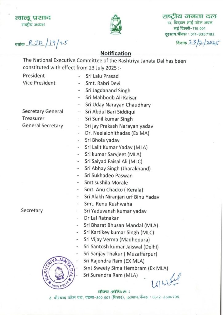 राजद ने पार्टी के कोर वोटर कहे जाने वाले मुस्लिम, यादव के अलावा सवर्ण, दलित, महिला, पिछड़ा, अतिपिछड़ा समुदाय के नेताओं को भी जगह दी है. पार्टी के प्रदेश प्रवक्ता चितरंजन गगन ने कहा कि पूर्व मुख्यमंत्री राबड़ी देवी, राजद के पूर्व प्रदेश अध्यक्ष जगदानंद सिंह, पूर्व सांसद महबूब अली कैसर और पूर्व विधानसभा अध्यक्ष उदय नारायण चौधरी को राष्ट्रीय उपाध्यक्ष बनाया गया है. पार्टी के वरिष्ठ नेता पूर्व मंत्री अब्दुलबारी सिद्दिकी को राष्ट्रीय प्रधान राष्ट्रीय कोषाध्यक्ष मनोनीत किया गया है.