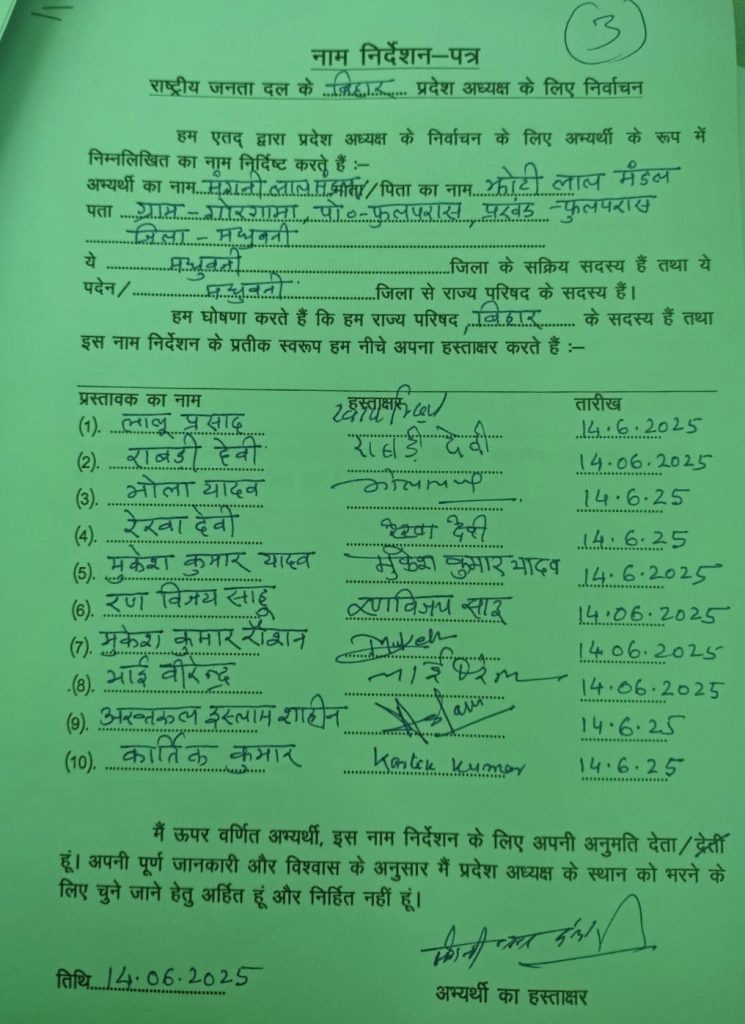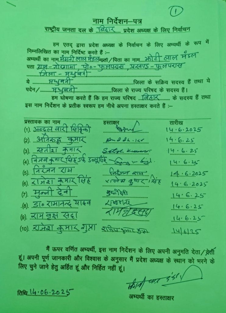 पार्टी के राष्ट्रीय सहायक निर्वाचन पदाधिकारी चितरंजन गगन ने कहा कि 19 जून को पार्टी के प्रदेश अध्यक्ष के तौर पर मंगनी लाल मंडल के नाम की औपचारिक घोषणा होगी.