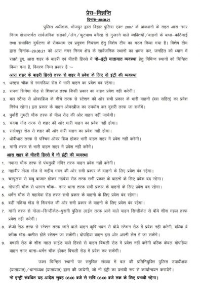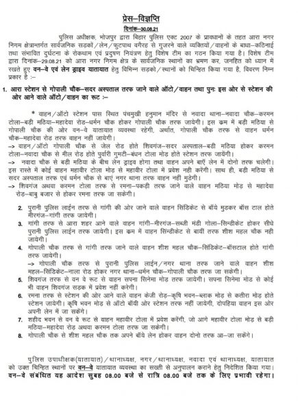 - आरा स्टेशन से गोपाली चौक- सदर अस्पताल तरफ जाने वाले ऑटो, वाहन और पुनः इस ओर से स्टेशन की ओर आने वाले ऑटो और वाहनों का रूट :-वाहन और ऑटो स्टेशन पास स्थित पंचमुखी हनुमान मंदिर से नवादा थाना नवादा चौक- करमन टोला – बड़ी मठिया महादेवा रोड-धर्मन चौक होकर गोपाली चौक तरफ जायेगी। इस क्रम में बड़ी मठिया से गोपाली चौक की ओर वन-वे यातायात व्यवस्था रहेगी। गोपाली चौक तरफ से वाहन धर्मन चौक- महादेवा रोड की ओर वाहन नहीं जायेंगे।