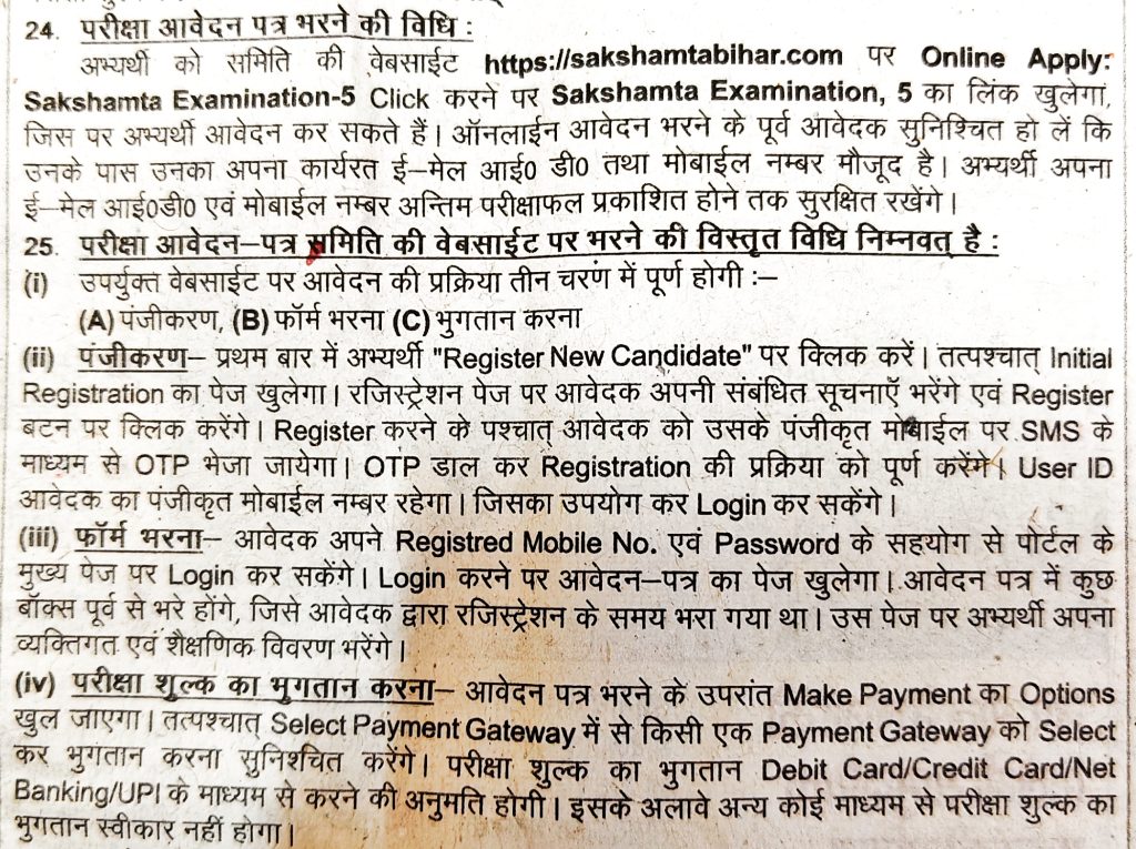 आवेदन का लिंक https://sakshamtabihar.com/ पर जाकर ऑनलाइन आवेदन कर सकते हैं. आवेदन शुल्क 1100 रुपये निर्धारित किया गया है. बोर्ड ने कहा है कि सक्षमता परीक्षा पंचम में वैसे शिक्षक अभ्यर्थी जो सक्षमता प्रथम, द्वितीय, तृतीय और चतुर्थ में शामिल हुए हैं या अनुत्तीर्ण हुए हैं वो शामिल हो सकते हैं. इसके साथ ही वैसे शिक्षक अभ्यर्थी जिन्होंने चतुर्थ के लिए आवेदन किया, परीक्षा शुल्क जमा किया लेकिन किसी कारणवश उनका परीक्षा आवेदन पत्र डीपीओ स्थापना द्वारा अनुमोदित नहीं किया गया, वैसे अभ्यर्थी भी शामिल हो सकते हैं. ऐसे अभ्यर्थियों को शुल्क नहीं देना होगा, केवल आवेदन भरना होगा.