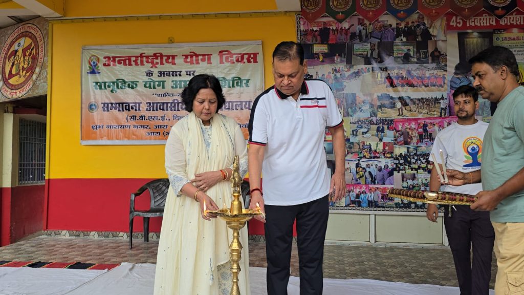 आरा, 21 जून. अंतरराष्ट्रीय योग दिवस के अवसर पर आरा के शुभ नारायण नगर, मझौवाँ स्थित शान्ति स्मृति सम्भावना आवासीय उच्च विद्यालय में आज भव्य सामूहिक योग अभ्यास शिविर का आयोजन समारोहपूर्वक किया गया. कार्यक्रम की शुरुआत विद्यालय के प्रबंध निदेशक डॉ. कुमार द्विजेन्द्र एवं प्राचार्या डॉ. अर्चना सिंह द्वारा दीप प्रज्वलन के साथ हुई.