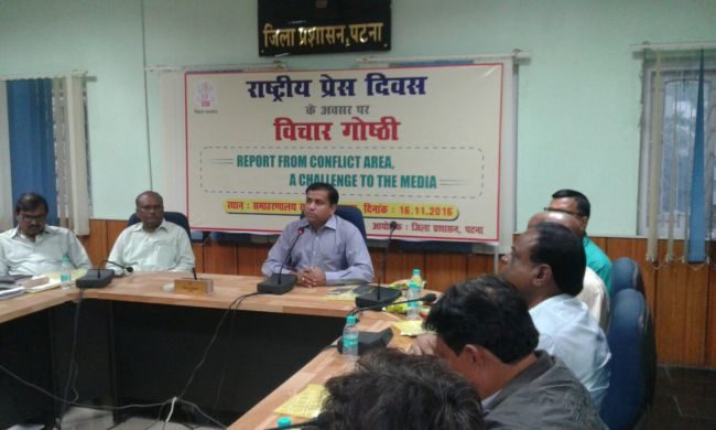राष्ट्रीय प्रेस दिवस के अवसर पर समाहरणालय सभागार में विचार गोष्ठी का आयोजन किया गया.इस अवसर परजिलाधिकारी पटना संजय कुमार अग्रवाल सहित समाहरणालय के सभी शाखाओं के प्रभारी पदाधिकारियो के साथ साथ प्रिंट मीडिया एवं इलेक्ट्रॉनिक मीडिया के संवाददाताओं ने इस परिचर्चा में शिरकत किया. Report from Conflict area,A challenge to media विषय पर परिचर्चा का आयोजन किया गया .इस मौके पर जिलाधिकारी संजय कुमार अग्रवाल में कहा कि लोकतंत्र के चौथे स्तम्भ की जरुरत हमें हर वक्त पड़ती है .एक ऐसा स्तम्भ है मीडिया जो हमारी नजरों से दूर की घटनाओं को ,कितने संघर्ष झेलते हुए समस्यायों को हम तक मिनटों में पहुंचाते है.आज के दौर में मीडिया को खुली आजादी मिलनी ही चाहिए तभी हम सच को सामने ला सकते हैं .उन्होंने कहा कि जिला प्रशासन भी कोशिश करता है कि हम भी उन्हें समय -समय पर जरूरत के अनुसार सही जानकारी उपलब्ध करा सकें. इस अवसर पर कई वक्ताओं ने पत्रकारों की सुरक्षा के सवाल पर भी अपने-अपने विचारों से अवगत कराया .