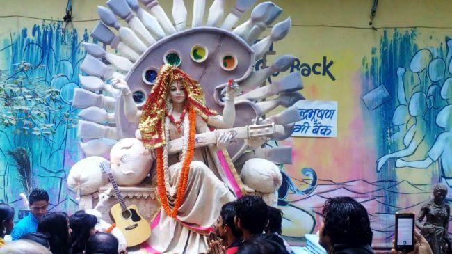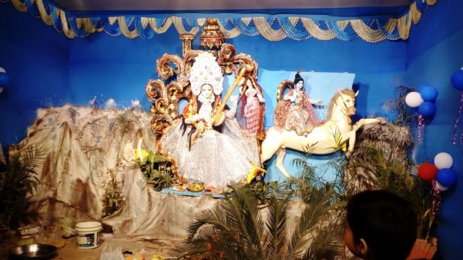 अगली तस्वीर है पटना के बोरिंग कनाल रोड की. हड़ताली मोड़ के नजदीक सरस्वती की प्रतिमा के साथ भव्य सजावट भी देखते बन रही है.