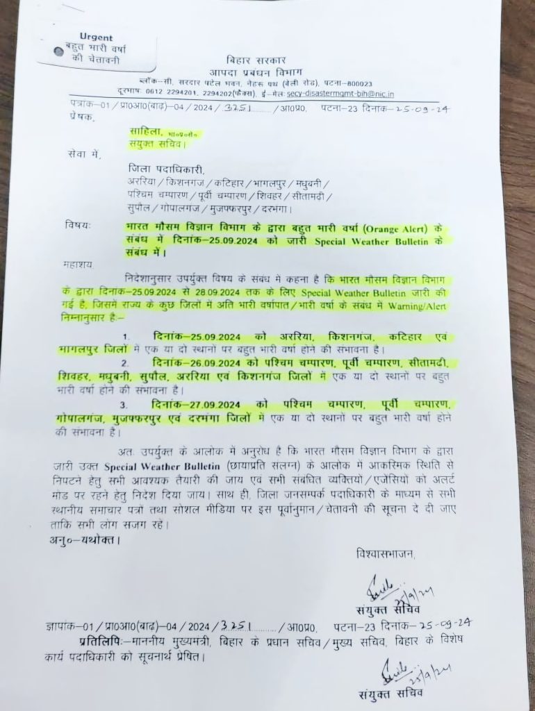 - दिनांक-27.09.2024 को पश्चिम चम्पारण, पूर्वी चम्पारण,गोपालगंज, मुजफ्फरपुर एवं दरभंगा जिलों में एक या दो स्थानों पर बहुत भारी वर्षा होने की संभावना है.