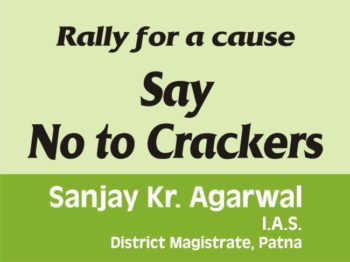 दीपावली को लेकर पटना जिला प्रशासन ने SAY NO TO CRACKERS अभियान की शुरुआत की है जिसके तहत विभिन्न स्कूलों के बच्चों और अग्निशाम सेवा के अधिकारियों ने मिला कर आज एक रैली निकाली.रैली फ्लैग ऑफ़ पटना-होमगार्ड के DG पी एन राय और डीएम संजय कुमार अग्रवाल ने किया. जिला प्रशासन का “SAY NO TO CRACKERS” और “FIRE SAFTY” को लेकर रैली निकाली गई. डाकबंगला चौराहे से रैली का शुभारम्भ हुआ. रैली में शामिल लोगों ने अपील कि इस दीपावली वे पटाखे न फोड़े .प्रकृति का ख्याल रखें. इस मौके पर डीजी होमगार्ड पी एन राय ने कहा कि पटाखा नहीं फोड़ने से बचने वाली राशि का इस्तेमाल गरीबों के लिए करें तो इससे बड़ा काम नहीं हो सकता. वहीँ जिलाधिकारी संजय कुमार अग्रवाल ने कहा कि पटाखा फोड़ने के क्रम में कई बच्चे जल जाते है कई बार अपंगता का शिकार हो जाते है इससे हमें सतर्क रहना होगा.इस मौके पर जिला प्रशासन बच्चों के बीच जागरूकता के लिए पेंटिंग,निबंध नारा और वाद- विवाद प्रतियोगिता का भी आयोजन कर रहा है.