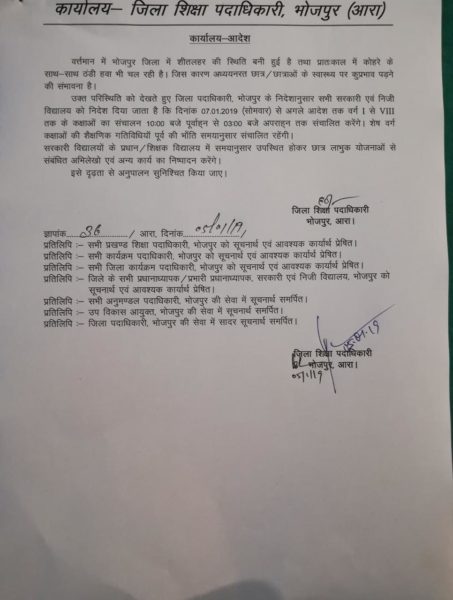 आरा, 6 जनवरी. बढ़ती हुई ठंड एवं सर्द हवाओं को देखते हुए भोजपुर जिलाधिकारी, संजीव कुमार ने आदेश निर्गत किया है, कि दिनांक 07.01.2019 से अगले आदेश तक कक्षा 1 से लेकर 8वीं तक की सभी कक्षाएँ सुबह 10 बजे से संचालित होंगी. जिलाधिकारी ने यह निर्णय छोटे बच्चों के स्वास्थ्य को देखते हुए लिया है ताकि ठंड से उन्हें बचाया जा सके.