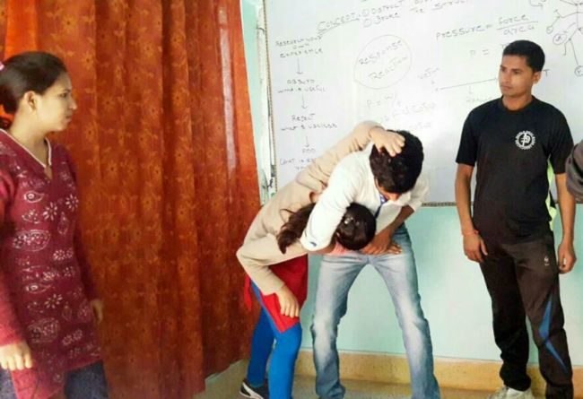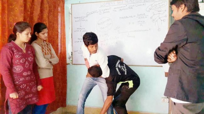 युवतियों को दे रहे सेल्फ डिफेंस की ट्रेनिंग