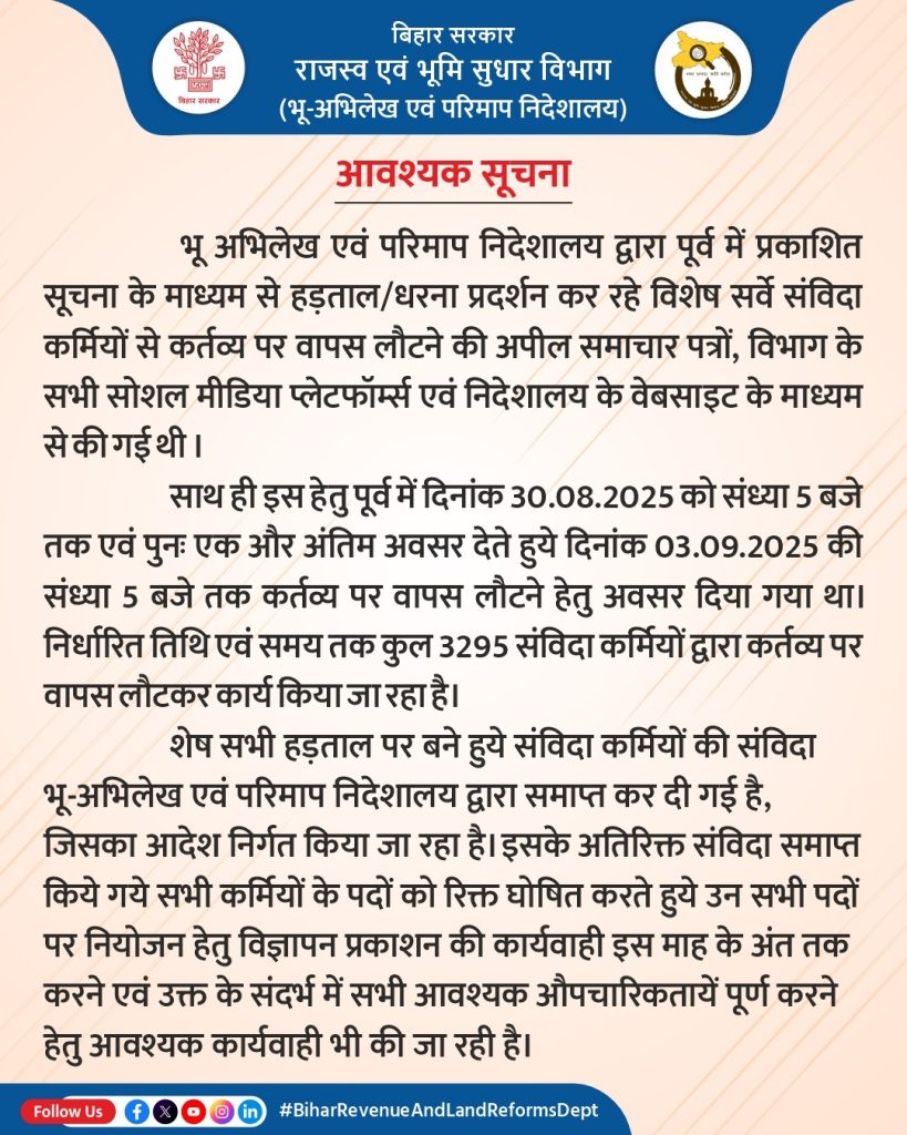 दरअसल विभाग के द्वारा पूर्व में प्रकाशित सूचना के माध्यम से हड़ताल/धरना प्रदर्शन कर रहे विशेष सर्वे संविदा कर्मियों से कर्तव्य पर वापस लौटने की अपील समाचार पत्रों, विभाग के सभी सोशल मीडिया प्लेटफॉर्म्स एवं निदेशालय के वेबसाइट के माध्यम से की गई थी. साथ ही इस हेतु पूर्व में दिनांक 30.08.2025 को संध्या 5 बजे तक एवं पुनः एक और अंतिम अवसर देते हुये दिनांक 03.09.2025 की संध्या 5 बजे तक कर्तव्य पर वापस लौटने हेतु अवसर दिया गया था. निर्धारित तिथि एवं समय तक कुल 3295 संविदा कर्मियों द्वारा कर्तव्य पर वापस लौटकर कार्य किया जा रहा है.