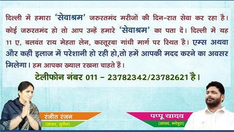 कभी वे पूरे कोसी क्षेत्र में डॉक्टरों की ज्यादतियों के खिलाफ जनता के पक्ष में आंदोलन छेड़ते हुए सड़क पर नजर आते हैं तो कभी दिल्ली स्थित अपने सेवाश्रम में मरीजों का हाल चाल लेते. पप्पू यादव की पत्नी रंजीत रंजन भी कांग्रेस से सांसद है. दोनों के सरकारी आवास सटे हुए है. पप्पू यादव पत्नी के आवंटित बंग्ले में रहते हैं और अपने सरकारी आवास को पार्टी दफ्तर के साथ सेवाश्रम बना दिया है. इनका सेवाश्रम कस्तूरबा गांधी मार्ग के 11ए, बलवंत राय मेहता लेन में स्थित है. इस ‘सेवाश्रम’ में करीब पांच सौ मरीजों के रहने की व्यवस्था है. जहां बिहार सहित अन्य प्रदेशों से आये सैकड़ो मरीज न सिर्फ दिल्ली में चिकित्सा सेवा ले रहे हैं. पप्पू यादव के सेवाश्रम में उनके ईलाज से लेकर खाने—पीने रहने का बेहतर प्रबंध है. पप्पू यादव खुद इसकी देख-रेख करते हैं ताकि किसी मरीज को कोई परेशानी न हो. उनके सरकारी आवास का दरवाजा मरीजों के लिए 24 घंटे खुला है. बस उस आवास में मरीज अपने परिजन के साथ आ जाएं उनके देख रेख की जिम्मेवारी पप्पू यादव की होती है .