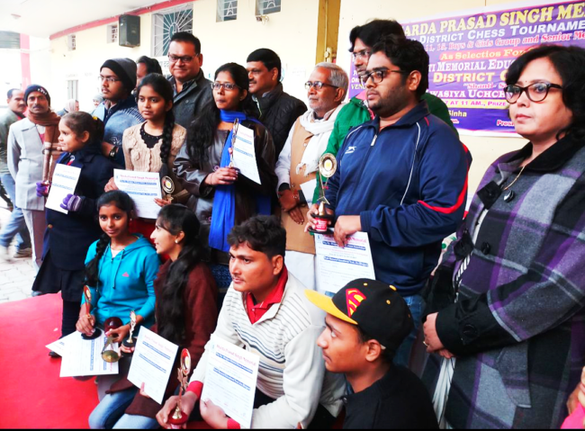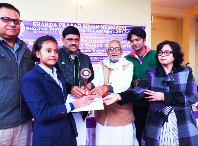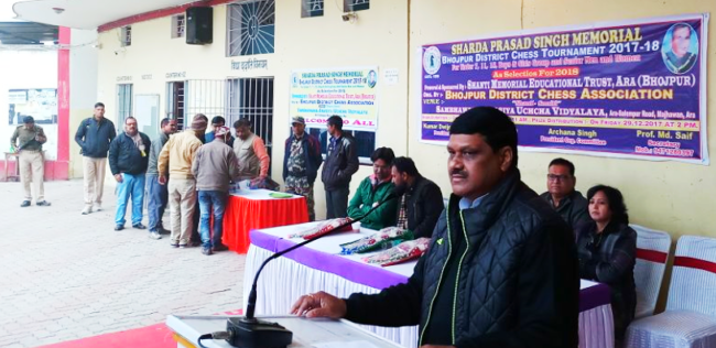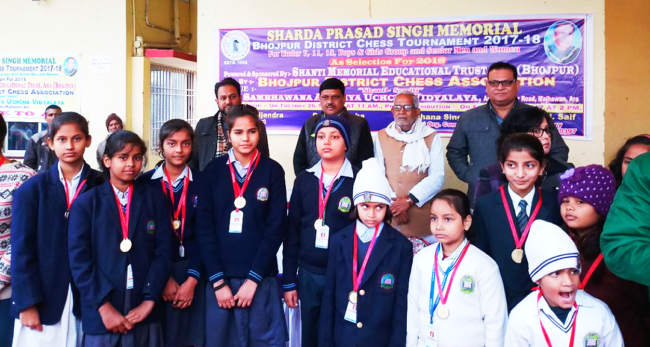 भोजपुर जिला शतरंज संघ द्वारा आयोजित और शांति स्मृति शैक्षणिक न्यास द्वारा प्रायोजित चार दिवसीय स्व. शारदा प्रसाद सिंह मेमोरियल जिला स्तरीय शतरंज टूर्नामेंट का समापन खिलाड़ियों को पुरस्कृत करने के साथ ही हो गया. 26-29 दिसंबर तक चलने वाले प्रतियोगिता में विभिन्न स्कूल और कॉलेजो से लगभग 300 प्रतिभागियों ने हिस्सा लिया था. 300 प्रतिभागियों ने इन चार दिनों में शतरंज की बिसात पर अपने मोहरों के साथ लगभग 750 बाजियां खेलीं. चौथे और अंतिम दिन भी खिलाड़ियों ने एक दूसरे को मात देने के लिए सुबह से ही प्यादों की चाल एक दूसरे को मात देने के लिए चलते रहे, जिसका फैसला 2 बजे दोपहर तक हुआ.
