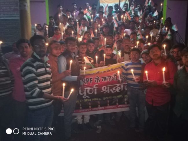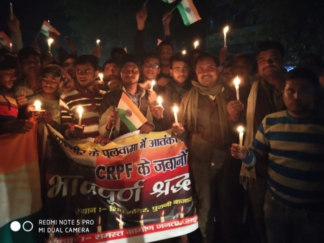 गड़हनी | पुलवामा में मारे गए भारतीय सैनिकों के प्रति संवेदना प्रकट करते हुए ग्रामीणों ने जगह-जगह से कई छोटी बड़ी टोलियों में कैंडिल मार्च निकाल कर शहीदों को नम आंखों से श्रद्धांजलि दी. गाँव-गाँव तक हर टोले-मोहल्ले के क्या आम क्या खास…सभी अभी भारतीय नजर आ रहे हैं. शहीदों को लोग कैंडिल जला कर श्रद्धांजलि दी रहे हैं और पाकिस्तान का नामोनिशान मिटाने के लिए आंखों में धधकती ज्वाला की तरह आक्रोश में किसी हद को पार करने की मुड में दिखने लगे हैं. गड़हनी से भी ऐसा कई दलों ने कैंडल मार्च निकाला. जिसमे पुरानी बाजार से पूर्व प्रमुख सुनय परमार उर्फ बब्लू सिंह के अध्यक्षता में कैंडल मार्च निकाला गया. इस टोली में समिति सदस्य छोटन सिंह,युवा मोर्चा के महामंत्री चंदन सोनी,उपेन्द्र केशरी, सरपंच लव कुमार ,विजय केशरी, श्री निवास यादव, प्रमोद गुप्ता,रामबाबू गुप्ता रतन सोनी,भोला केशरी,सोहन गुप्ता,सुधीर,छोटू, बजरंग दल संयोजक टुनटुन केशरी,नीरज गुप्ता,पम्मू सोनी,राहुल सोनी,बंटी राठौर,शोभराज केशरी,ऋतुराज केशरी समेत कई लोग शामिल थे.