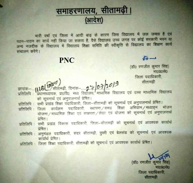 सीतामढ़ी डीएम ने जिले में बाढ़ के कारण स्कूलों के लिए नया निर्देश जारी किया है. सीतामढ़ी डीएम रंजीत कुमार सिंह के मुताबिक भारी बारिश और बाढ़ के कारण जिस स्कूल में जलजमाव है और जहां पठन-पाठन का कार्य नहीं किया जा सकता है, वैसे स्कूल किसी उच्च जगह पर कोई सरकारी भवन या अन्य नजदीक के स्कूल में स्कूल शिक्षा समिति की स्वीकृति से स्कूल का शिक्षण कार्य संचालन करेंगे. सीतामढ़ी डीएम ने यह आदेश शनिवार 27 जुलाई को जारी किया है.