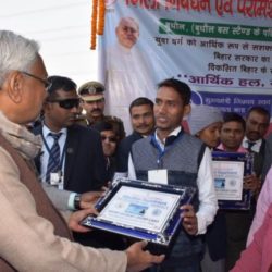 अवलोकन के क्रम में मुख्यमंत्री ने किसानों के बीच कृषि (सिंचाई) हेतु विद्युत कनेक्शन वितरित किया. इसके बाद बिहार शताब्दी निजी नलकूप योजना, मशरूम उत्पादन, मधुमक्खी पालन, गव्य विकास योजना एवं मुख्यमंत्री ग्राम परिवहन योजना का अनुदानित दर पर लाभुकों को उपलब्ध होने वाले लाभ से संबंधित चेक प्रदान किया. इसके अलावा स्टूडेंट क्रेडिट कार्ड, कुशल युवा कार्यक्रम एवं स्वयं सहायता के तहत चयनित लाभार्थियों को मुख्यमंत्री ने चेक/प्रमाण-पत्र प्रदान किया. आयुष्मान भारत के तहत प्रधानमंत्री जन आरोग्य योजना से संबंधित पाॅच लाभुकों को मुख्यमंत्री ने गोल्डन कार्ड एवं चार महिलाओं को जन वितरण प्रणाली का लाइसेंस प्रदान किया. जिला लोक शिकायत नवादा द्वारा तैयार की गई ‘निवारण’पत्रिका का मुख्यमंत्री ने लोकार्पण किया. मुख्यमंत्री ने दो लोगों को बेटी बचाओ, बेटी पढ़ाओ की दिशा में उत्कृष्ट कार्य के लिए बधाई संदेश पत्र दिया.