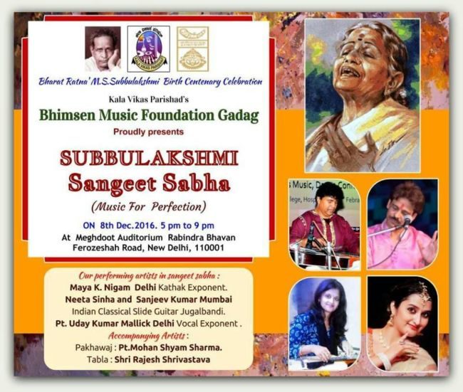 कलाविकास परिषद एवं भीमसेन म्युजिक फाउंडेेशन/गदग की ओर से आठ दिसंबर को संगीत नाटक अकादमी के मेेघदूत ऑडिटोरियम में शास्त्रीय संगीत संंध्या का आयोजन किया जा रहा है जिसमें देश नामी कलाकार शिरकत कर रहे हैं .इस कार्यक्रम का मुख्य उद्धेश्य शास्त्रीय गायन,वादन और नृत्य की सांस्कृतिक विरासत को नई पीढ़ी से रूबरू कराना .इस मौके पर दिल्ली की माया निगम का कथक नृत्य, मुंबर्इ्र के नीता सिन्हा एवं संजीव कुमार के इंडियन स्लाइट गिटार की जुगलबंदी एवं दिल्ली के पंडित उदय कुमार मल्लिक का ध्रुुपद गायन होगा.पखावज एवं तबले की संगति क्रमश: पंडित मोहन श्याम शर्मा एवं राजेश श्रीवास्तव करेंगे. यह एक सुनहला अवसर होगा जब श्रोताओं को ध्रुपद गायन के साथ पखवाज और तबले की युगलबंदी सुनने को मिलेगी .