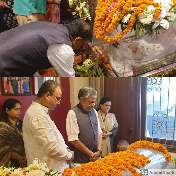 उपमुख्यमंत्री सुशील कुमार मोदी ने बिहार के पूर्व मुख्यमंत्री स्व. जगन्नाथ मिश्रा के दिल्ली स्थित आवास पर जाकर उनके पार्थिव शरीर पर श्रद्धा सुमन अर्पित किया. बिहार के पूर्व सीएम डॉ जगन्नाथ मिश्र के निधन पर उपमुख्यमंत्री सुशील कुमार मोदी ने गहरा दुख व्यक्त किया है.