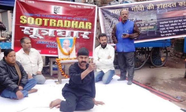 महात्मा गाँधी की 70वीं पुष्यतिथि पर नाट्य संस्था “सूत्रधार” ने पटना में खगौल के मोती चौक पर त्याग,प्रेम,सहिष्णुता एवं भाईचारे का संदेश देने के लिए नागरिक श्रद्धांजलि सभा का आयोजन किया. इस अवसर पर प्रस्तुत एकल नाटक “भगत सिंह-फांसी की काल कोठरी” में शोएब कुरैशी ने प्रभावशाली अभिनय से नाटक को जीवंत बना दिया. खगौल थानाध्यक्ष संजय कुमार पाण्डेय ने कहा कि अहिंसा एवं त्याग के पुजारी बापू के संदेशों पर चलकर ही हम उन्नति कर सकते हैं. उन्होंने कहा कि भारत ही नहीं बल्कि पूरे विश्व पटल पर गाँधी सिर्फ एक नाम नहीं अपितु शांति और अहिंसा के प्रतीक हैं. उन्होंने इस आयोजन के लिए सूत्रधार और उनके महासचिव नवाब आलम को बधाई दी .