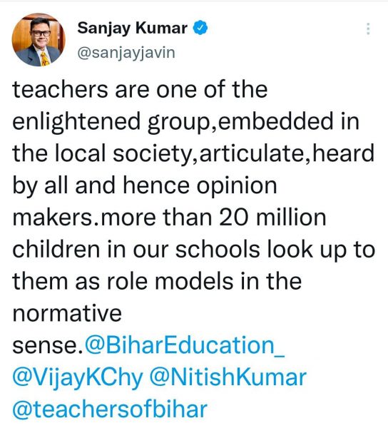 इधर शिक्षा विभाग के अपर मुख्य सचिव संजय कुमार ने कहा कि शिक्षकों को यह समझना चाहिए कि यह सिर्फ एक अपील है ना कि उन पर बाध्यकारी है. इसलिए इसे वापस लेने का कोई सवाल ही नहीं उठता. इधर शिक्षक संघों ने सरकार के इस आदेश के खिलाफ आंदोलन करने की चेतावनी दी है. बिहार राज्य प्राथमिक शिक्षक संघ के कार्यकारी अध्यक्ष मनोज कुमार ने पटना नाउ को बताया कि यह सरकार का तुगलकी फरमान है और अगर सरकार इसे वापस नहीं लेती है तो हम आंदोलन करने को बाध्य होंगे.