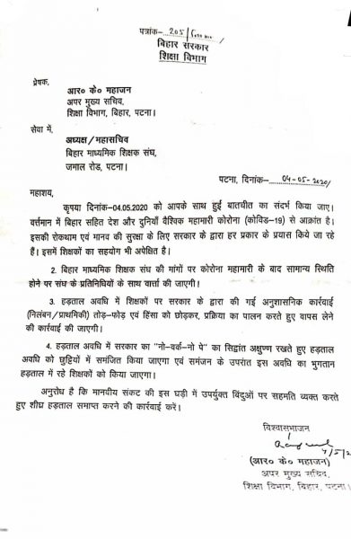 सरकार ने बिहार माध्यमिक शिक्षक संघ को आश्वासन दिया है कि शिक्षकों पर की गई अनुशासनिक कार्यवाई को वापस लिया जाएगा. कोरोनावायरस महामारी को देखते हुए फिलहाल शिक्षक को काम पर लौटने को कहा गया है. स्थिति सामान्य होने पर सरकार वार्ता करेगी. शिक्षकों के सबसे बड़े संघ शिक्षक संघर्ष समन्वय समिति ने भी हड़ताल खत्म करने की घोषणा की है. इस बात की पुष्टि दूसरे गुट बिहार शिक्षक संघर्ष समन्वय समिति के मीडिया प्रभारी मनोज कुमार ने की है.